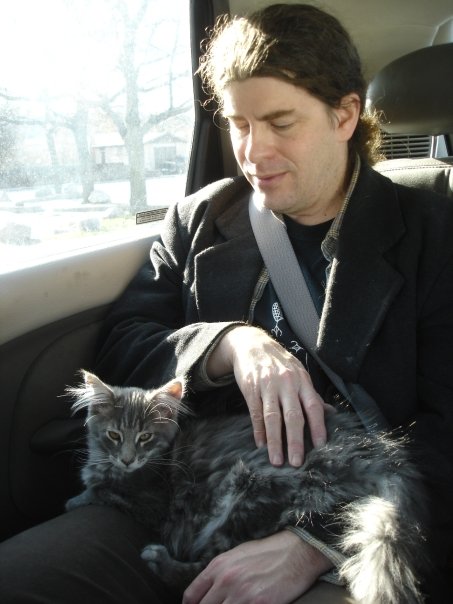 I haven't felt much like writing, lately. A few weeks ago, we had to make the terrible decision to let Séamus go. It was less than two years ago that we brought him home. He was a sweet, affectionate kitten, a tiny little thing with blue-gray fur and golden eyes. He was also the first cat I ever "picked out," who didn't come to me by circumstance. Here he is with Ted in the car. Ted sat in the back while I drove. It was cold, and Séamus was snuggled down in his lap.